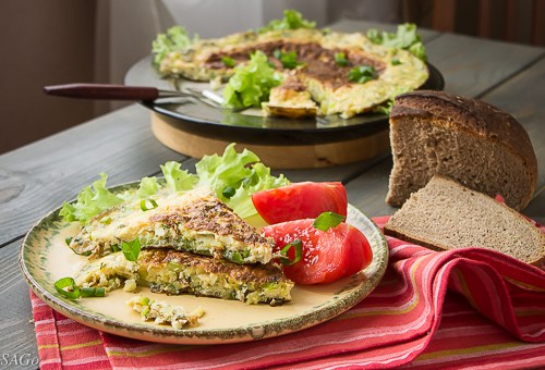 Кабачок почистить и измельчить. Обжарить на оливковом масле, добавить зеленый лук, горошек. Залить яйцами. Готовить 5-6 минут под крышкой, после чего распределить по поверхности сыр и готовить в разогретой до температуры 180 С духовке 5-7 минут.