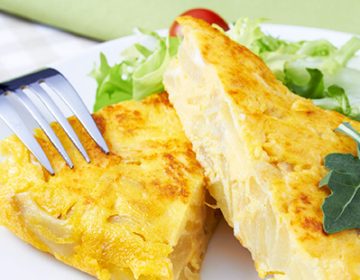 Шпинат выложить в дуршлаг, обдать кипятком, остудить под холодной водой и обсушить. Лук измельчить, картофель нарезать слайсами (круглыми ломтиками). В сковороде разогреть масло, обжарить картофель и лук 10-15 минут, добавить шпинат. Одновременно с обжаркой картофеля слегка взбить яйца, посолить, поперчить. Яичной смесью залить овощи. Поджарить омлет с одной стороны, затем, накрыв тарелкой, перевернуть сковороду и поджарить с другой стороны. Еще горячим разрезать на кусочки, как торт. В ланч-бокс можно уложить с чиабаттой и нарезанным помидором.