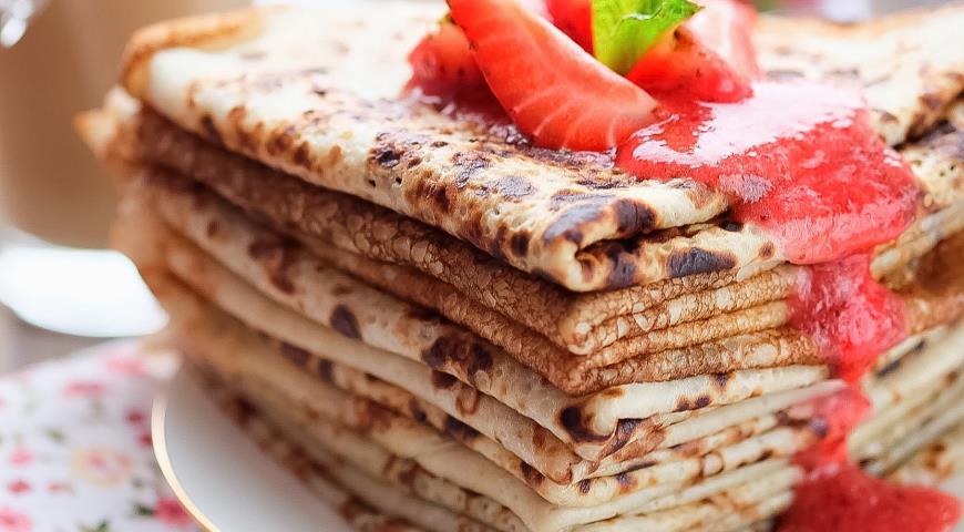 Яйцо взбить с сахаром. Следом влить кефир — взбить. Добавить чайную ложку соды, щепотку соли. Понемногу добавить муку, непрерывно взбивая. Тесто оставить на 30 минут. Через это время добавить кипяток и растительное масло. Окончательно взбить и жарить блины. Обращаю внимание — кипятка может понадобиться больше — если вы хотите получить именно тонкие блины. Если толстые с большим количеством дырочек — 200 мл будет достаточно. Для соуса размороженную клубнику взбить в блендере с небольшим количеством сахара. Полить блины соусом.