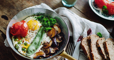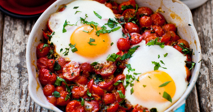 Облегченный вариант традиционной деревенской яичницы с помидорами, подвяленными в духовке. Сочные красные ягоды добавляют легкую кислинку, которую смягчает сладковатый вкус базилика.