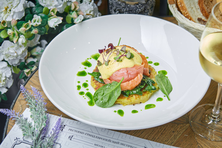 Для приготовления соуса берблан желтки заварить в сливках, добавить сливочное масло и затем остальные ингредиенты, перемешать до однородного состояния, загустить ксантаном. Картофель отварить до полуготовности, далее натереть на крупной тёрке,добавить крахмал, соль, перец. Сформировать небольшие драники и обжарить на растительном масле. Отварить яйцо-пашот. Шпинат мини обжарить на растительном масле. Далее выложить на тарелку картофель рости, шпинат мини обжаренный, лосось копчёный, яйцо пашот, соус берблан. Украсить шпинатом мини.