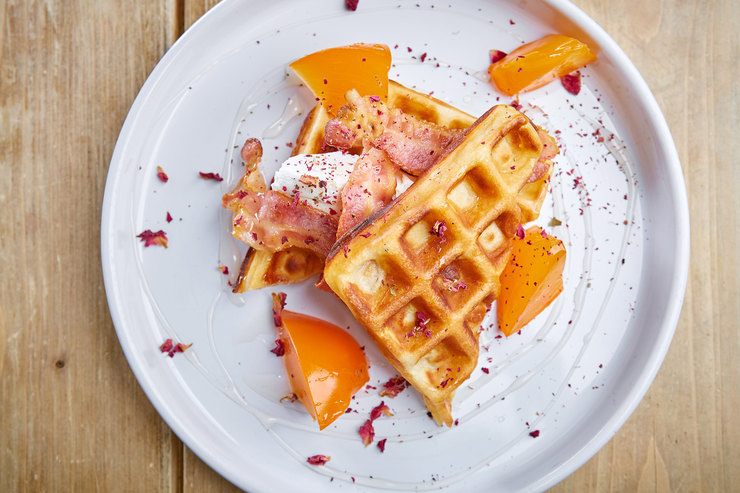 Отдельно замесить тесто и выпечь вафли в вафельнице. Выложить 2 вафли на блюдо,полить медом, сверху выложить творог, свежую хурму и слайсы жареного бекона. Украсить лепестками сушеной розы.