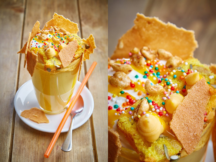 Все ингредиенты взбить в блендере и вылить в бокал для подачи. Отдельно взбить сливки и выложить сверху «шапкой». Украсить кондитерскими шариками, воздушными пшеничными хлопьями и слайсами печенья из тулипного теста.