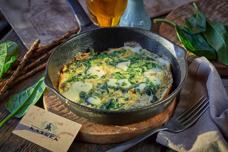 Нарезать кубиками репчатый лук. Мелко нарезанный чеснок вместе с луком обжарить до полуготовности на сковороде. Очистить и хорошо промыть шпинат. Поджаренную смесь обжарить со шпинатом 1−2 минуты. Когда шпинат будет немного обжарен, посыпать сванской солью. Залить немного взбитые яйца и еще раз посолить. Посыпать нарезанный кубиками сыр сулугуни и накрыть крышкой, чтобы сыр подпекся.
