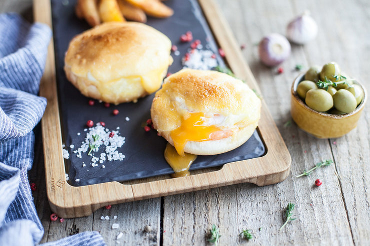 Разрежьте булочку пополам и подрумяньте на сухой тефлоновой сковороде. Налейте в небольшую кастрюлю воду, добавьте немного лимонного сока, поставьте на огонь и доведите до кипения. Для голландского соуса положите в миску три желтка и добавьте лимонный сок (25 мл). Поставьте миску на кастрюлю с кипящей водой (важно, чтобы миска не касалась поверхности воды). Взбивайте желтки с лимонным соком венчиком около 5 минут, пока они не станут пышными. Начните вливать растопленное масло тонкой струйкой,продолжая взбивать. Когда соус загустеет, снимите его с водяной бани, посолите и поперчите. Оставьте остывать. Два оставшихся яйца разбейте в отдельные небольшие миски. Вода с лимонным соком не должна кипеть, поэтому поставьте ее на медленный огонь. Ложкой сделайте в воде воронку и влейте туда одно яйцо. Варите его около 3,5 минут(в зависимости от размера яйца). Достаньте шумовкой. Проделайте то же самое со вторым яйцом. На поджаренные половины булочек положите начинку по вкусу — это может быть кусочек подкопченой семги, поджаренная ветчина, сыр или припущенный со сливками шпинат. Сверху выложите яйцо-пашот. Полейте голландским соусом. Разогрейте духовку в режиме «гриль» до максимума (220 градусов). Поставьте булочки с яйцом и соусом максимально близко к грилю на 30−45 секунд (яйцо не должно свариться). Подавайте блюдо с зеленым салатом или запеченным картофелем.
