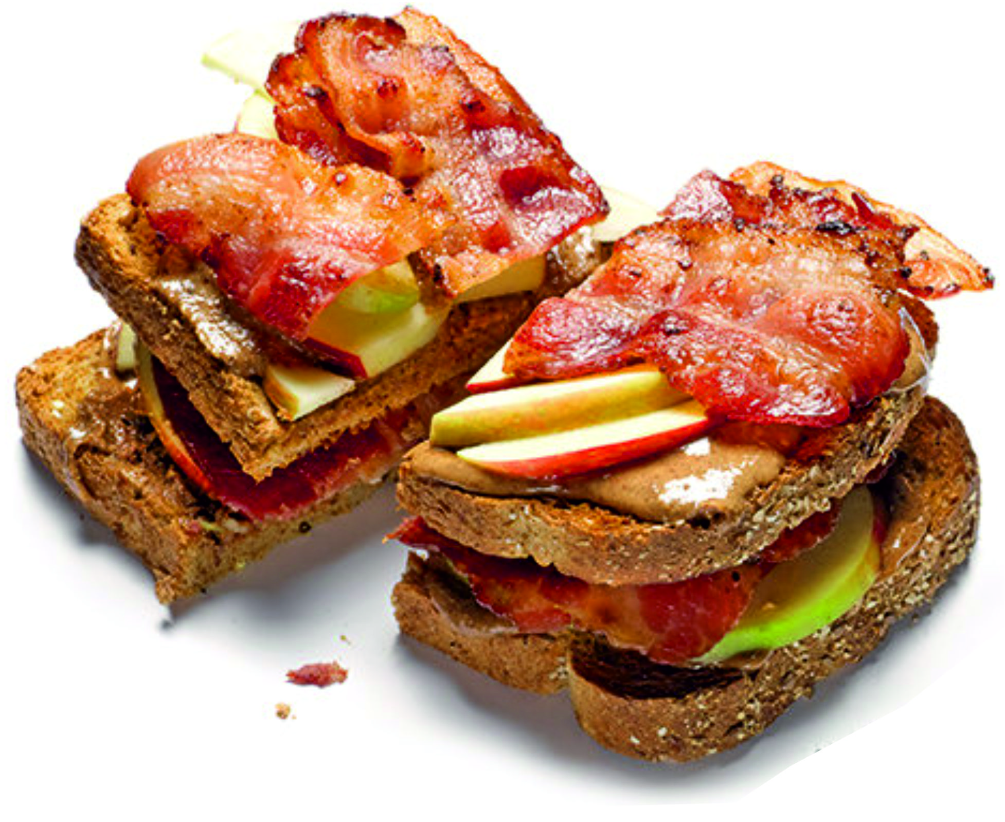 - Поджарьте 2 куска хлеба и намажьте на них две столовые ложки миндального или арахисового масла. Положите сверху несколько долек яблока и 2-3 куска хрустящего жареного бекона.