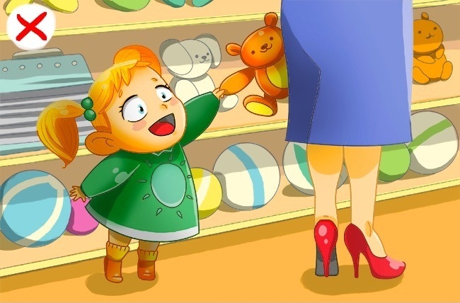 Ребенок трогает товары в магазине или настойчиво просит их купить