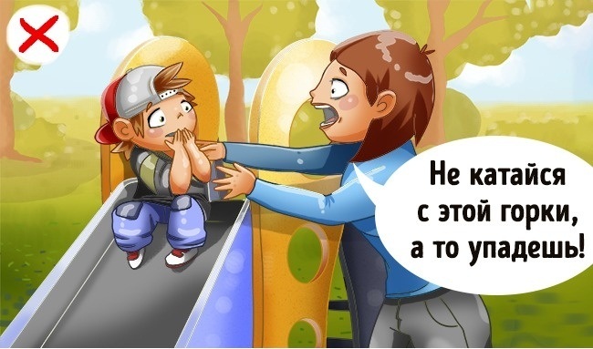 Когда взрослые искусственно создают барьеры для нормальной активности, ребенок боится отойти от родителей. Ведь в его голове уже стоит четкая установка, что если он залезет на горку, то обязательно упадет; если он скатится с горки, обязательно порвет одежду, и т. д.