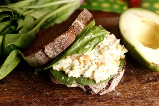 Смешайте все ингредиенты, кроме листьев салата, в миске. Выложите на хлеб сначала листья салата, потом смесь, затем снова салат и накройте это всё вторым куском хлеба.