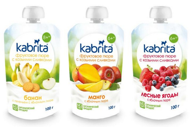 Фруктовые пюре Kabrita со сливками козьего молока – это сытные, вкусные и полезные десерты, которые помогут маме разнообразить меню даже самого привередливого малыша. Пюре Kabrita это 100% натуральный продукт приготовленный из органического фруктового пюре с добавлением натуральных сливок козьего молока.