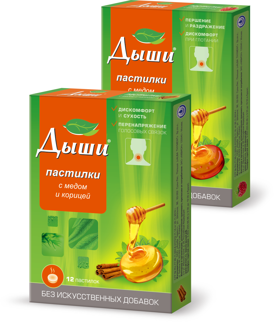 Пастилки Дыши – Пастилки Дыши с медом и корицей предназначены для того, чтобы после длительной нагрузки на голосовые связки восстановить нормальное состояние горла без дополнительной лекарственной нагрузки на организм, а также смягчить гортань при регулярном голосовом напряжении.
